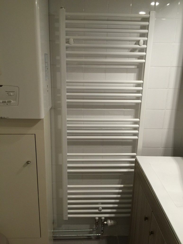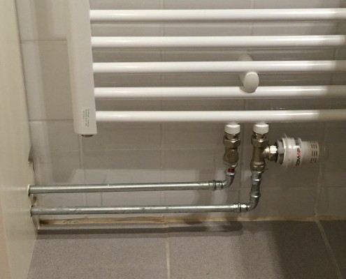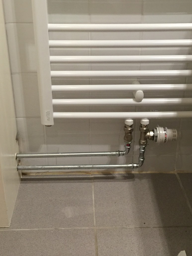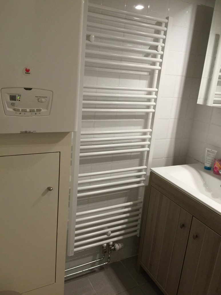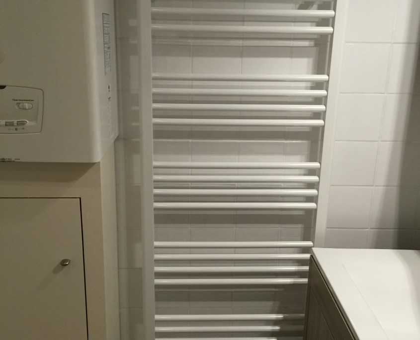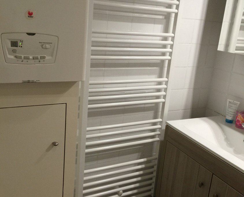 Remplacement d’un radiateur traditionnel dans une salle de bain par un sèche-serviette.