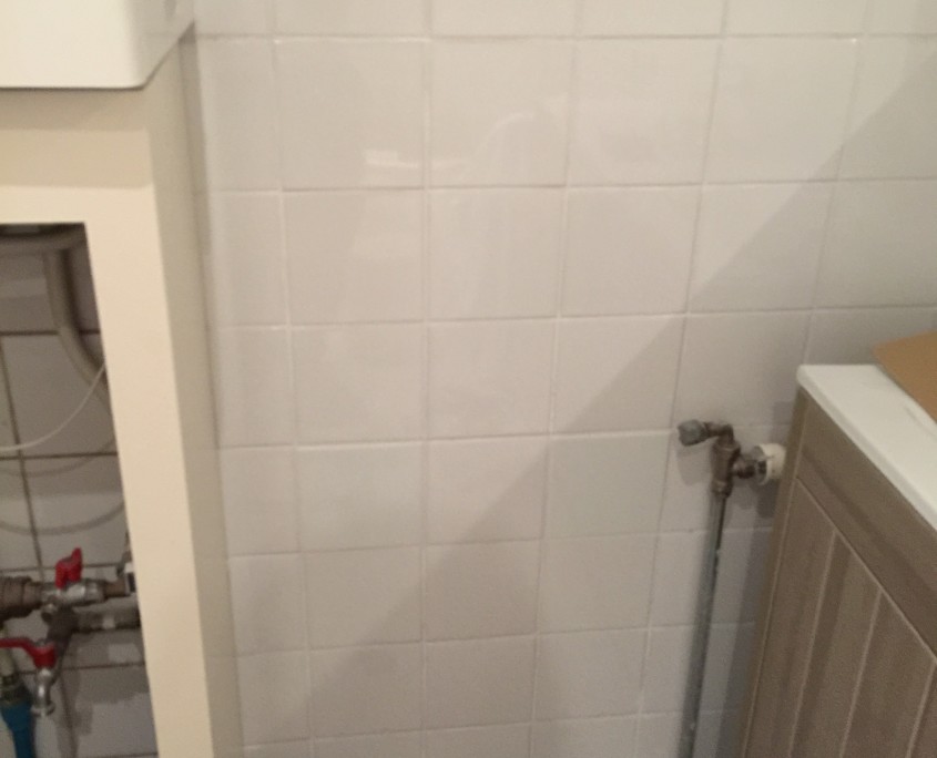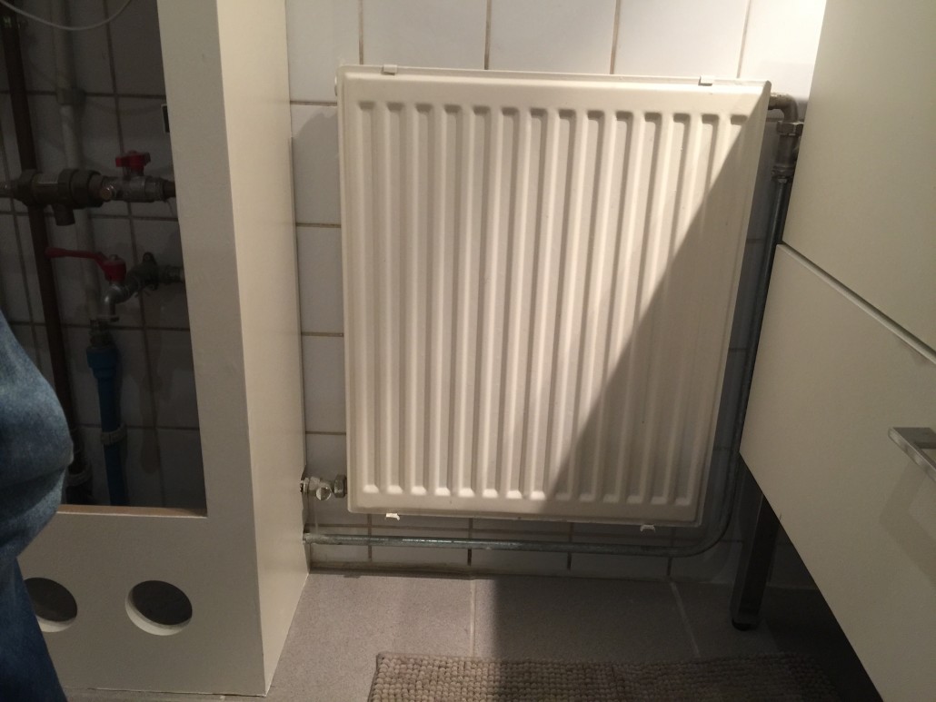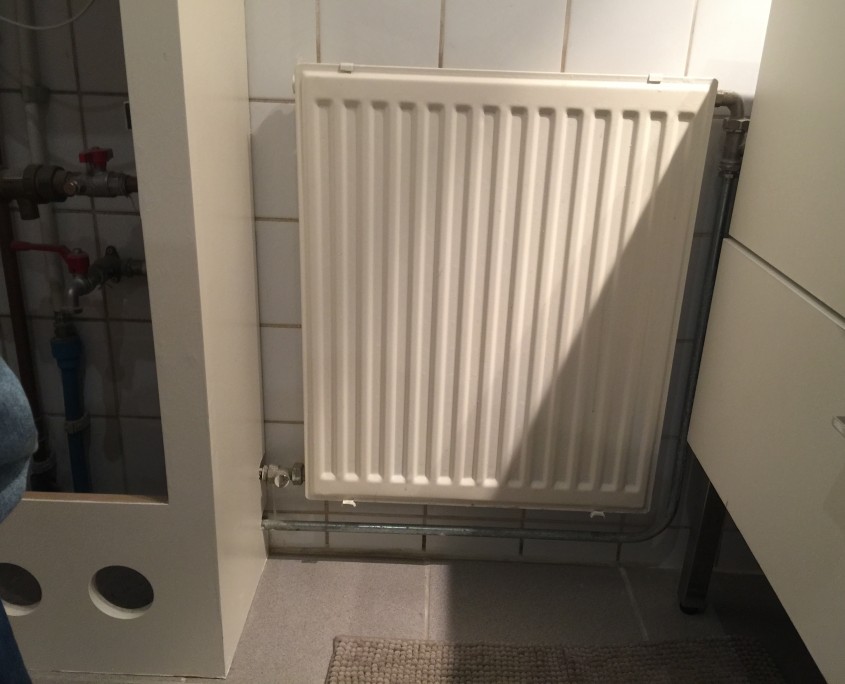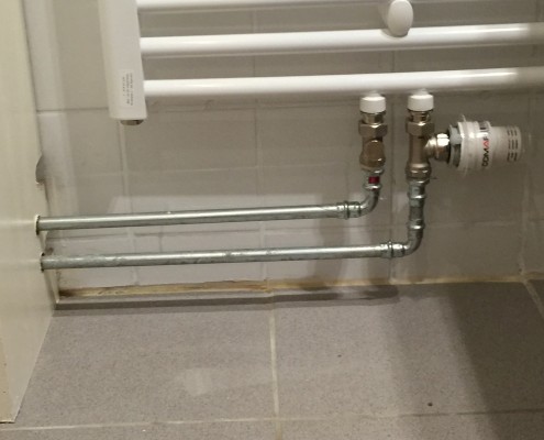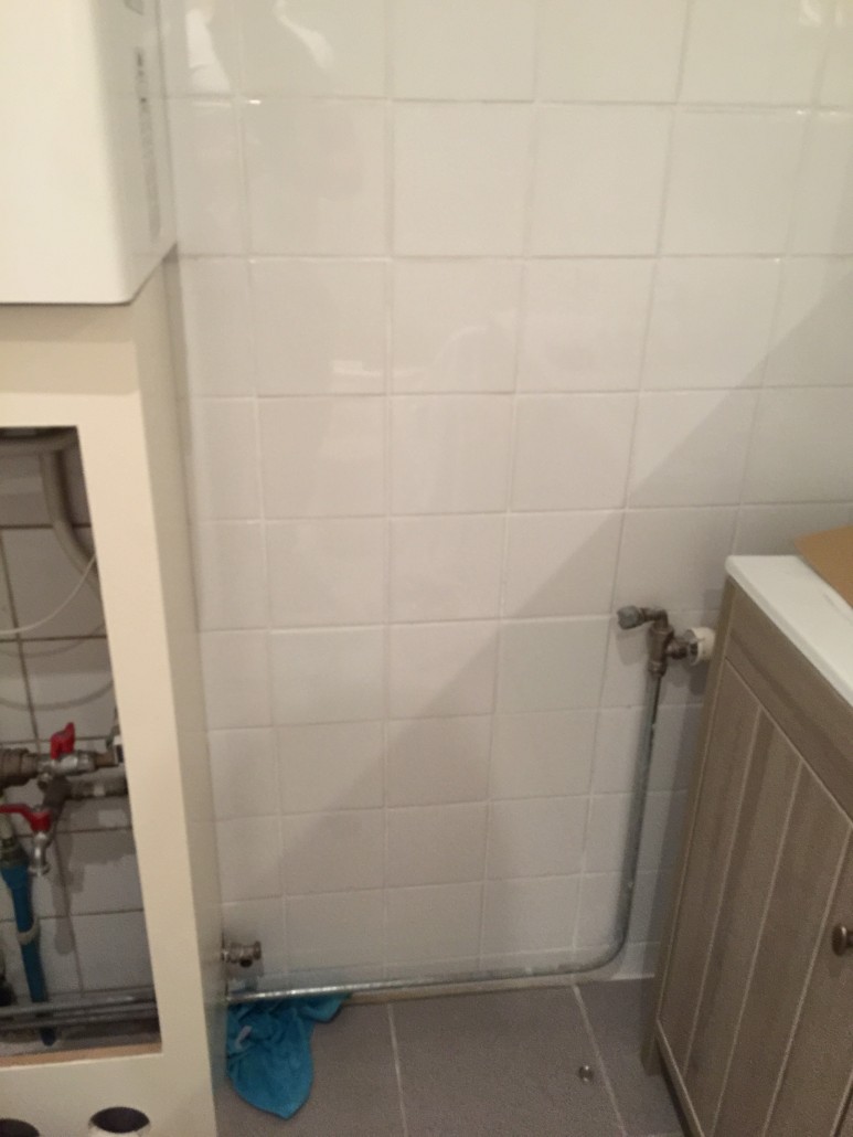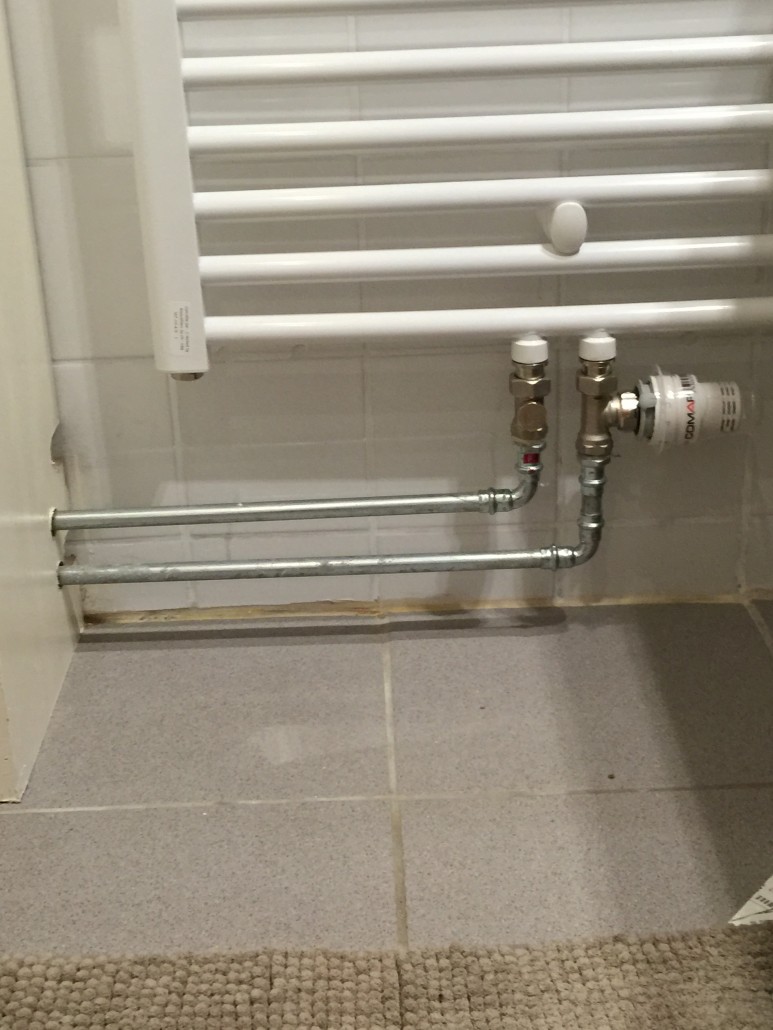 Remplacement d’un radiateur traditionnel dans une salle de bain par un sèche-serviette.